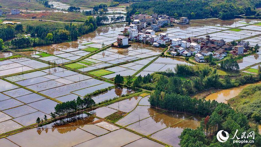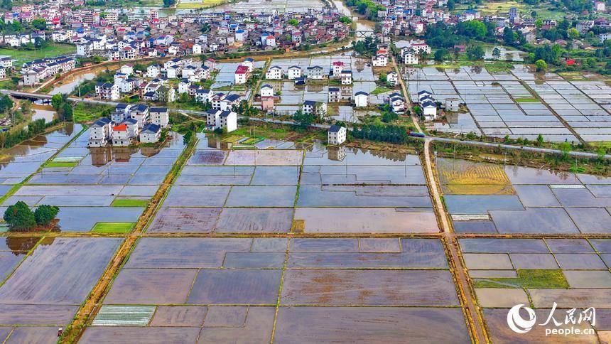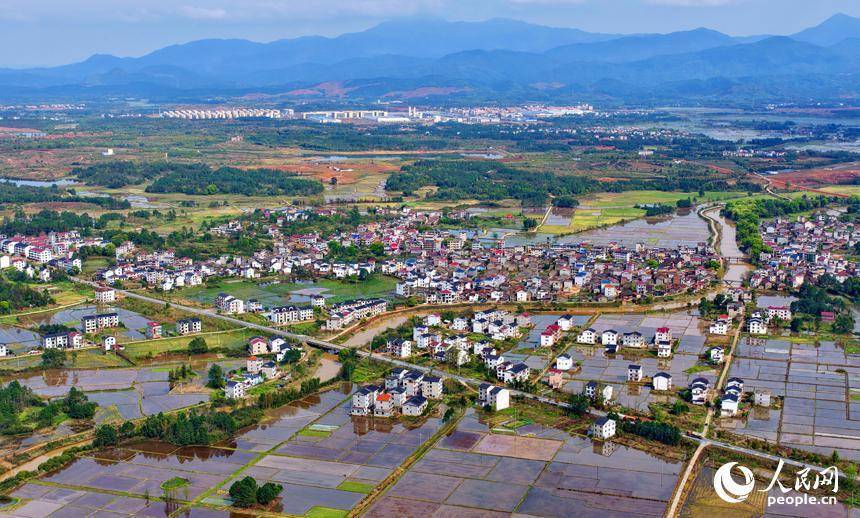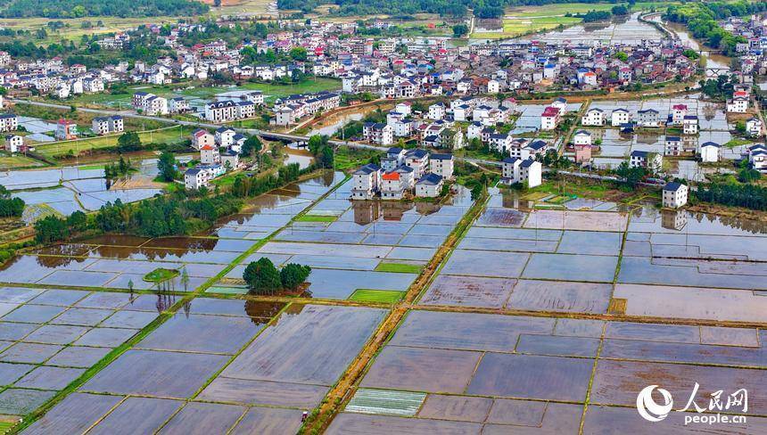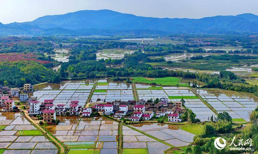 乐安县龚坊镇陀上村一带,灌溉打浆后的农田与蜿蜒的灌渠、错落有致的房屋、纵横交织的公路相互映衬,美如画卷。人民网记者 朱海鹏摄