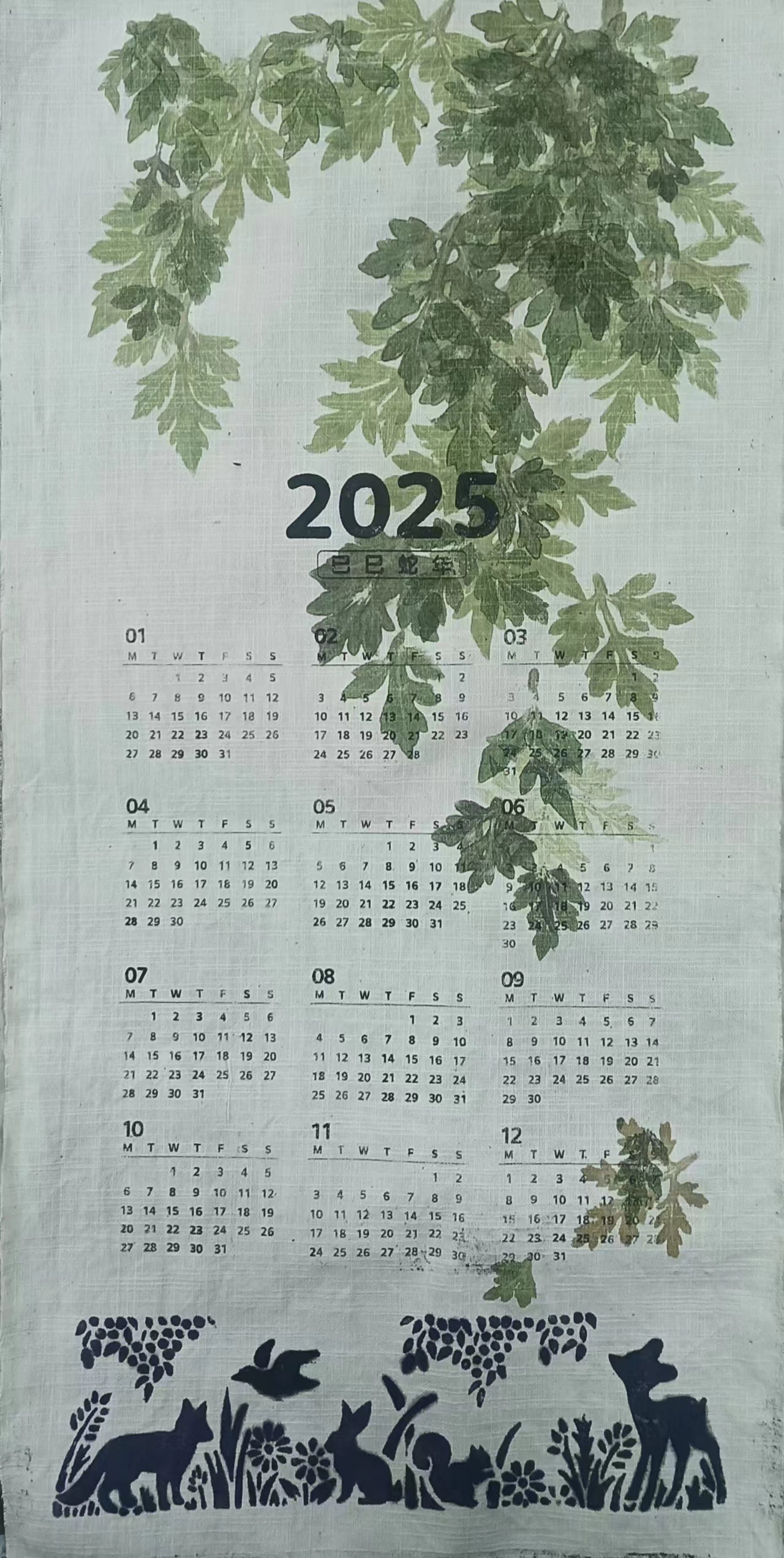 为了让捶草印花更好地融入现代生活,姚春玲还尝试将食用碱、绿矾、明矾等作为固色剂进行实验,“它们虽然能让部分作品颜色更持久,但固色后的颜色会变得暗沉,失去天然的鲜亮感。”因此,在部分文创作品如冰箱贴、日历的创作中,她不会进行固色处理而是追求自然的捶印效果,尽量把叶子的细节留在布上,即使褪色,也如逼真的枯叶。“自然的东西本就鲜活,褪色也是它生命历程的一部分。”姚春玲认为,捶草印花作品随着时间推移逐渐褪色,如同叶子从鲜艳到凋零的自然演变,蕴含着深刻的生命哲理。